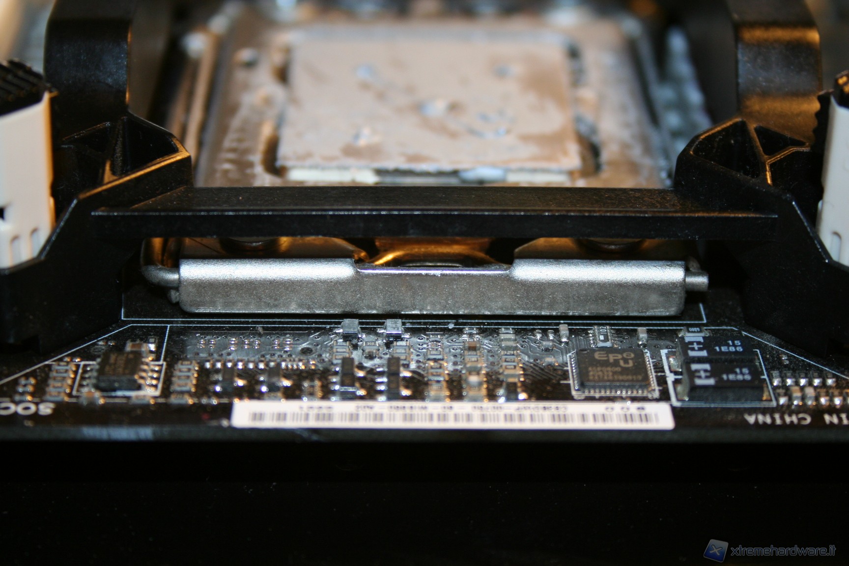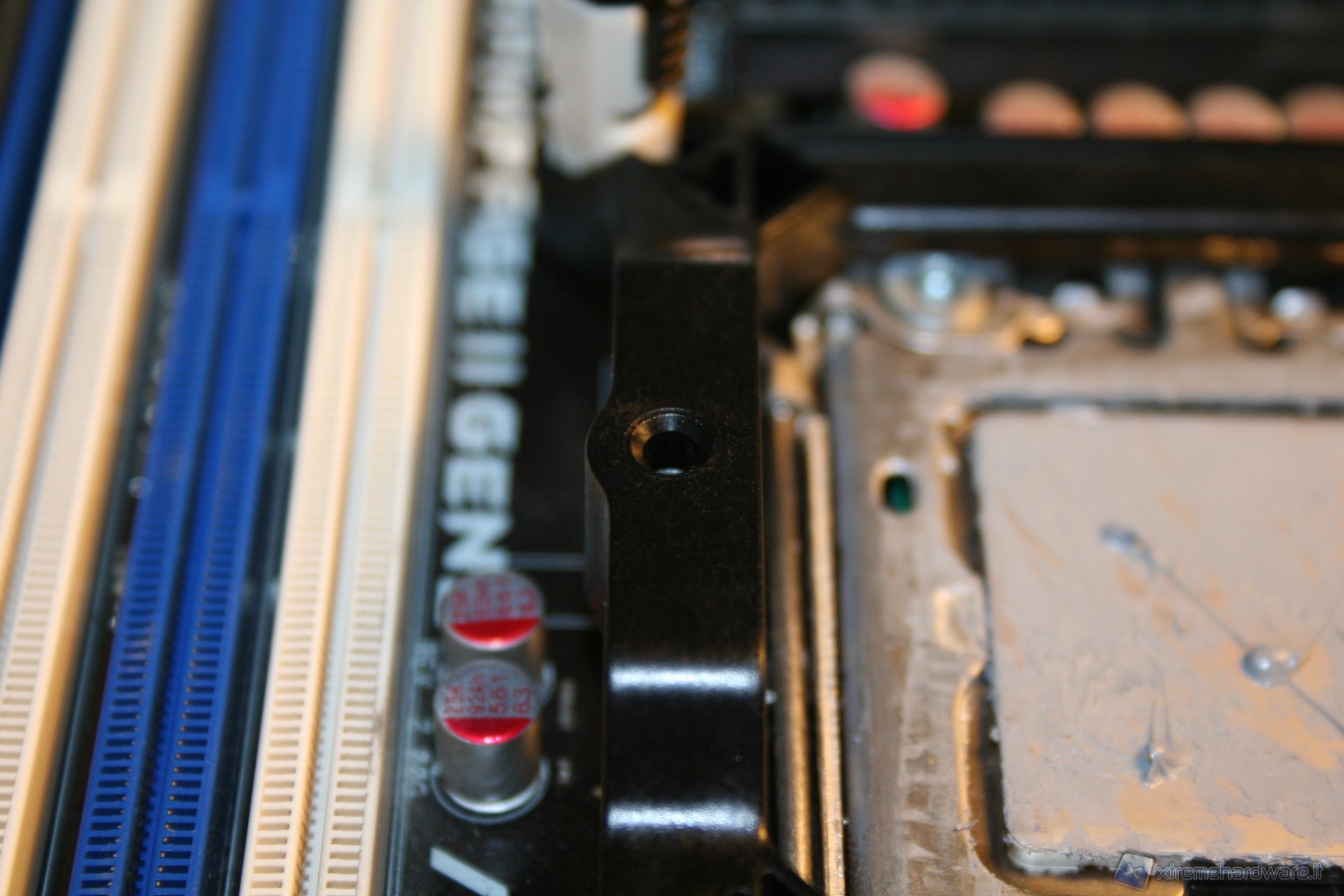 Fatto questo bisogna inserire, nel sistema di bloccaggio anteriore, i quattro perni di colore bianco forniti in dotazione, all’interno delle fessure più esterne, proprie dei sistemi aventi socket LGA 1366. Fate attenzione ad inserire correttamente le due estremità all’interno della fessura principale, come riportato nel manuale e come potete vedere dalla fotografia. Dopo questo passaggio bisogna apporre l’intera struttura vicino al socket del processore; fatto questo bisogna inserire gli altri quattro autobloccanti di colore nero all’interno dei quattro perni precedentemente menzionati e premere verso il basso fino al bloccaggio. Così facendo la struttura diventerà un corpo unico e sarà molto stabile.